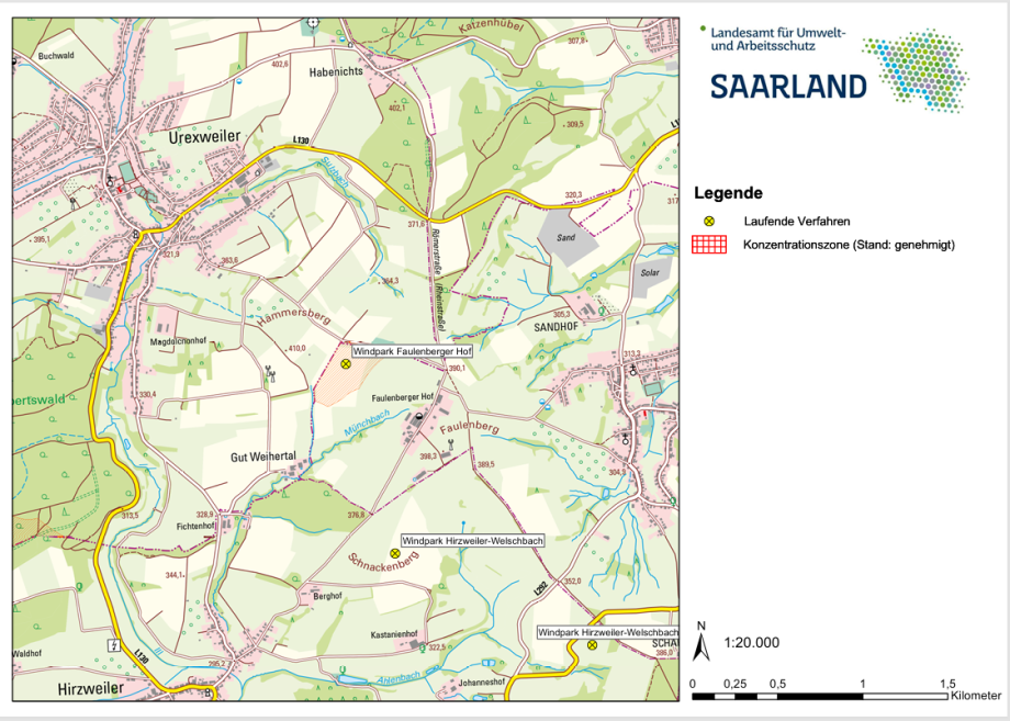 Im Bereich nordöstlich von Hirzweiler und Welschbach wurden Genehmigungsanträge für insgesamt 3 Windkraftanlagen eingereicht.